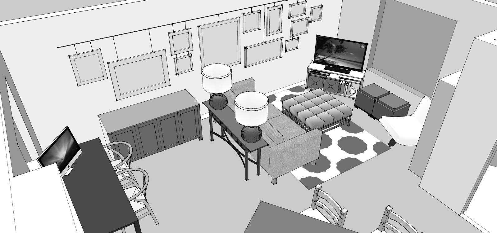 We decided to reconfigure the living room / office area. I was never very happy with how the furniture was arranged ... it's awkward since it is long and narrow and the kitchen island enters the space on an angle.