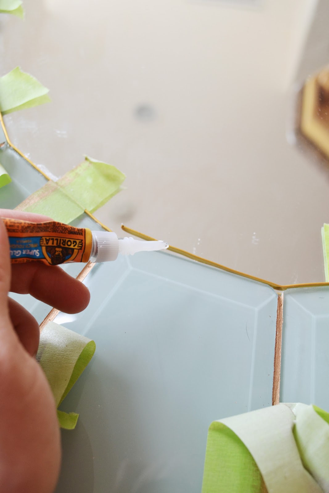 I glued the mirror with Weldbond glue to the plywood (using the pencil marks that I created earlier to center it)